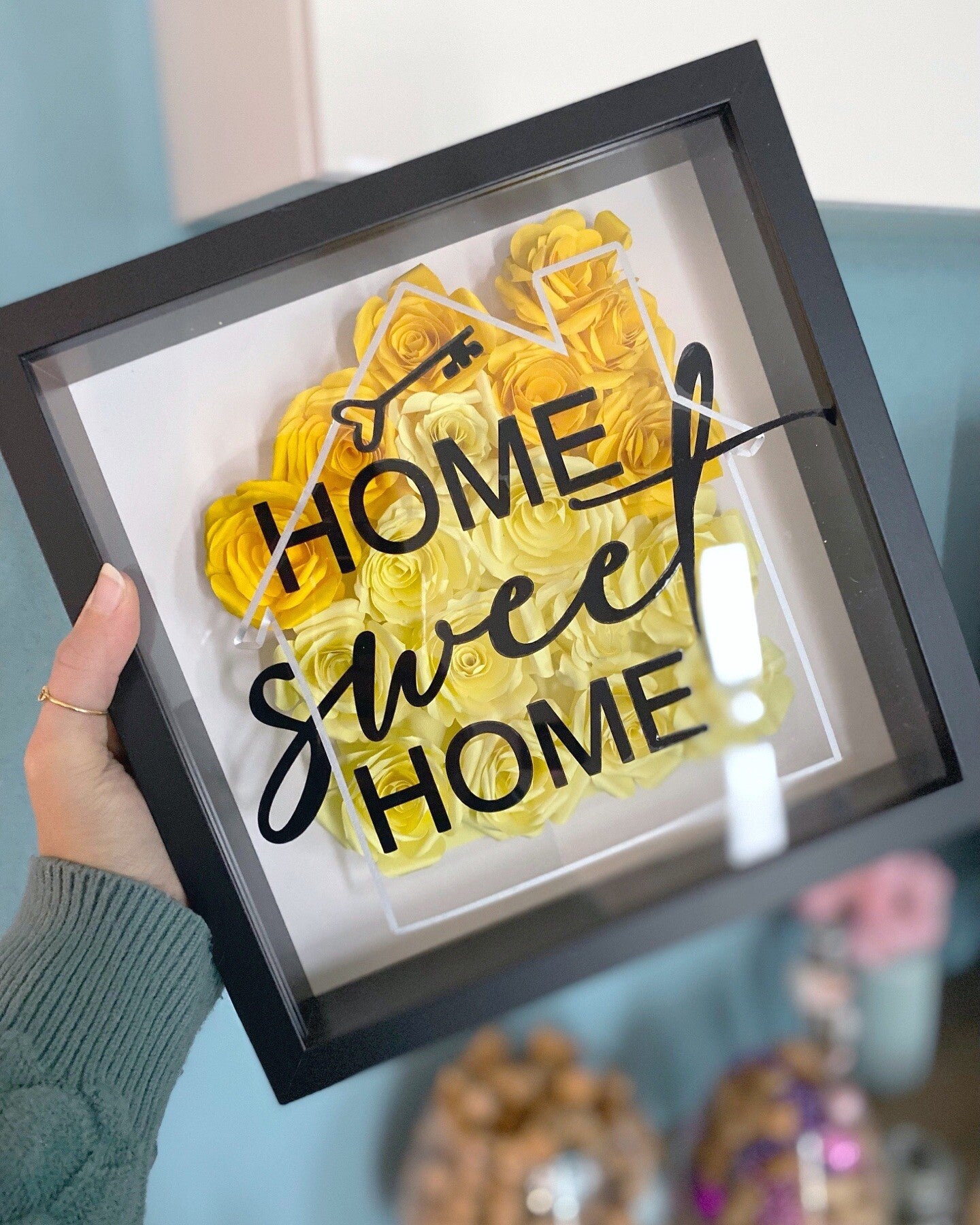 Quadretto 25x25cm con un disegno di rose di carta intagliate a mano e scritte frontali.