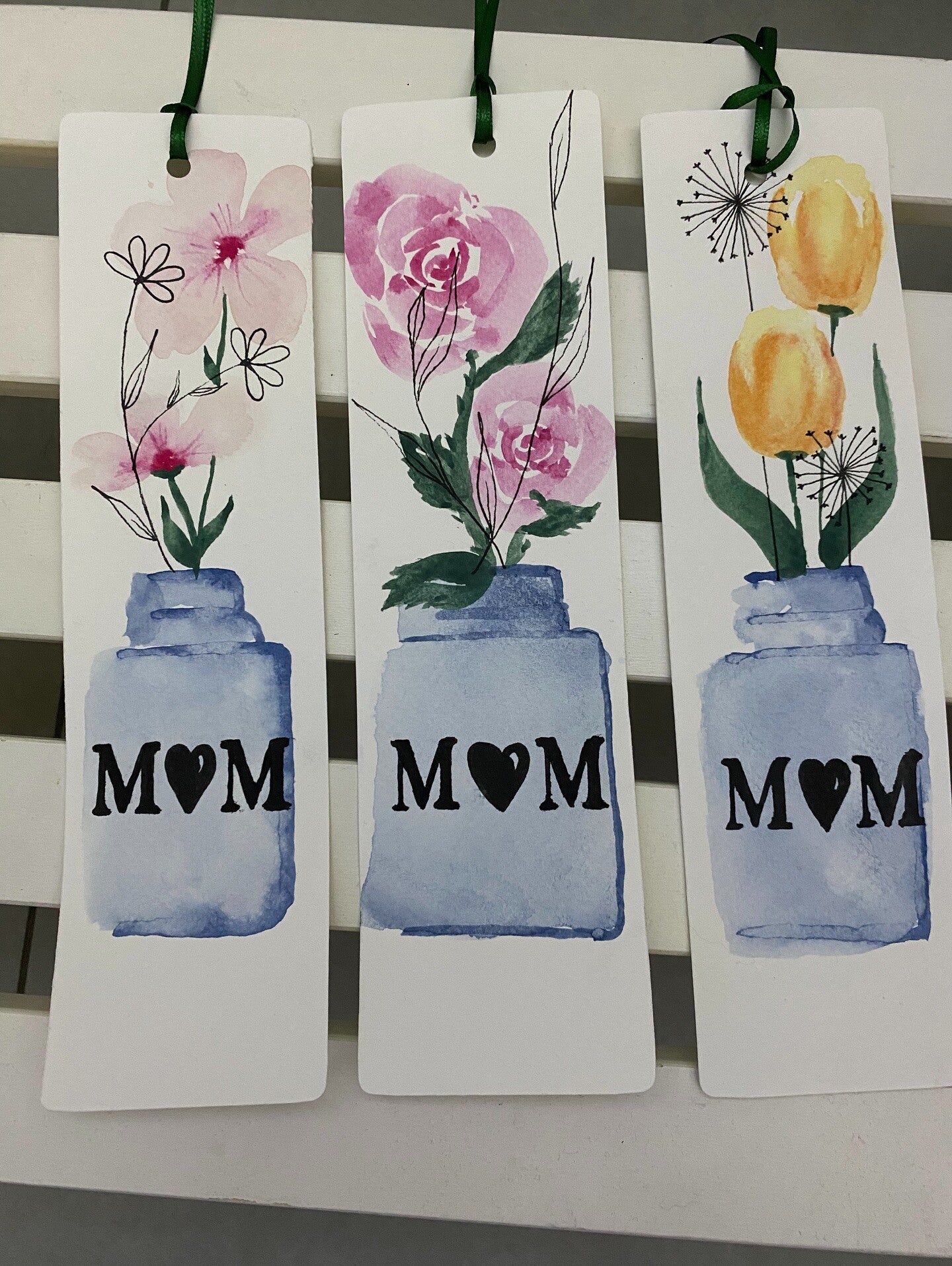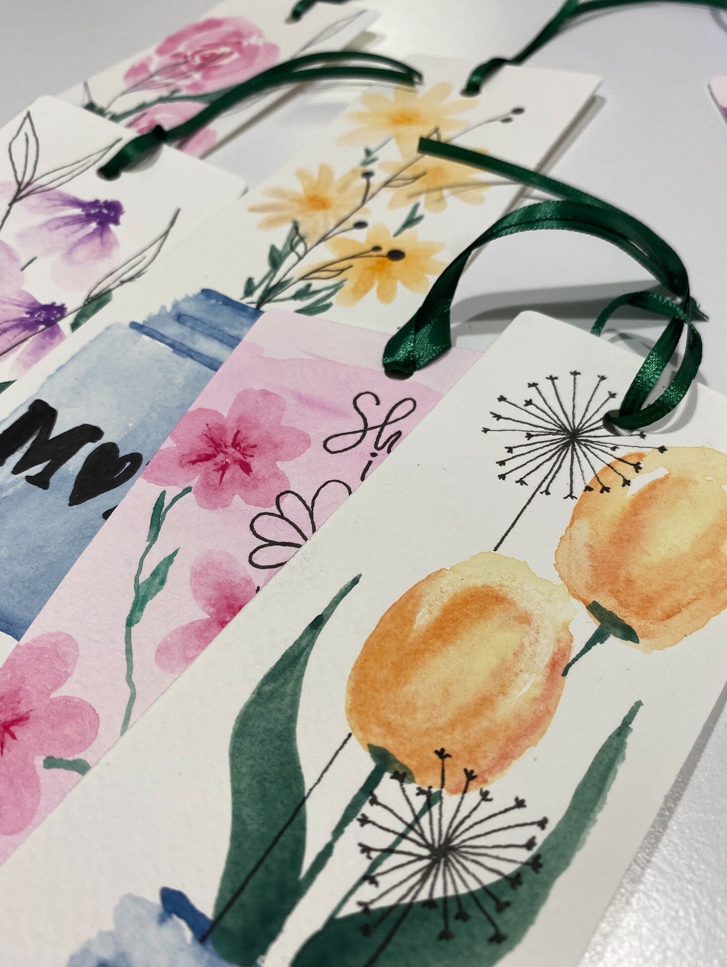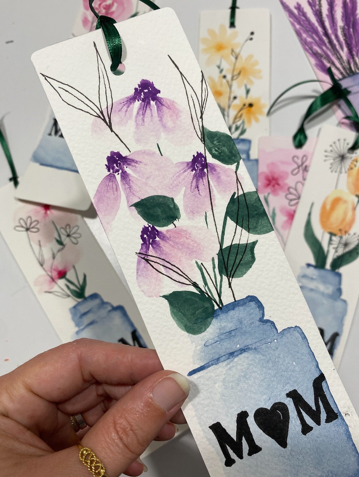 Un segnalibro in cartoncino spesso e ruvido con acquerello realizzato a mano rappresentante un vasetto con fiorellini, disegno in line art e nome.