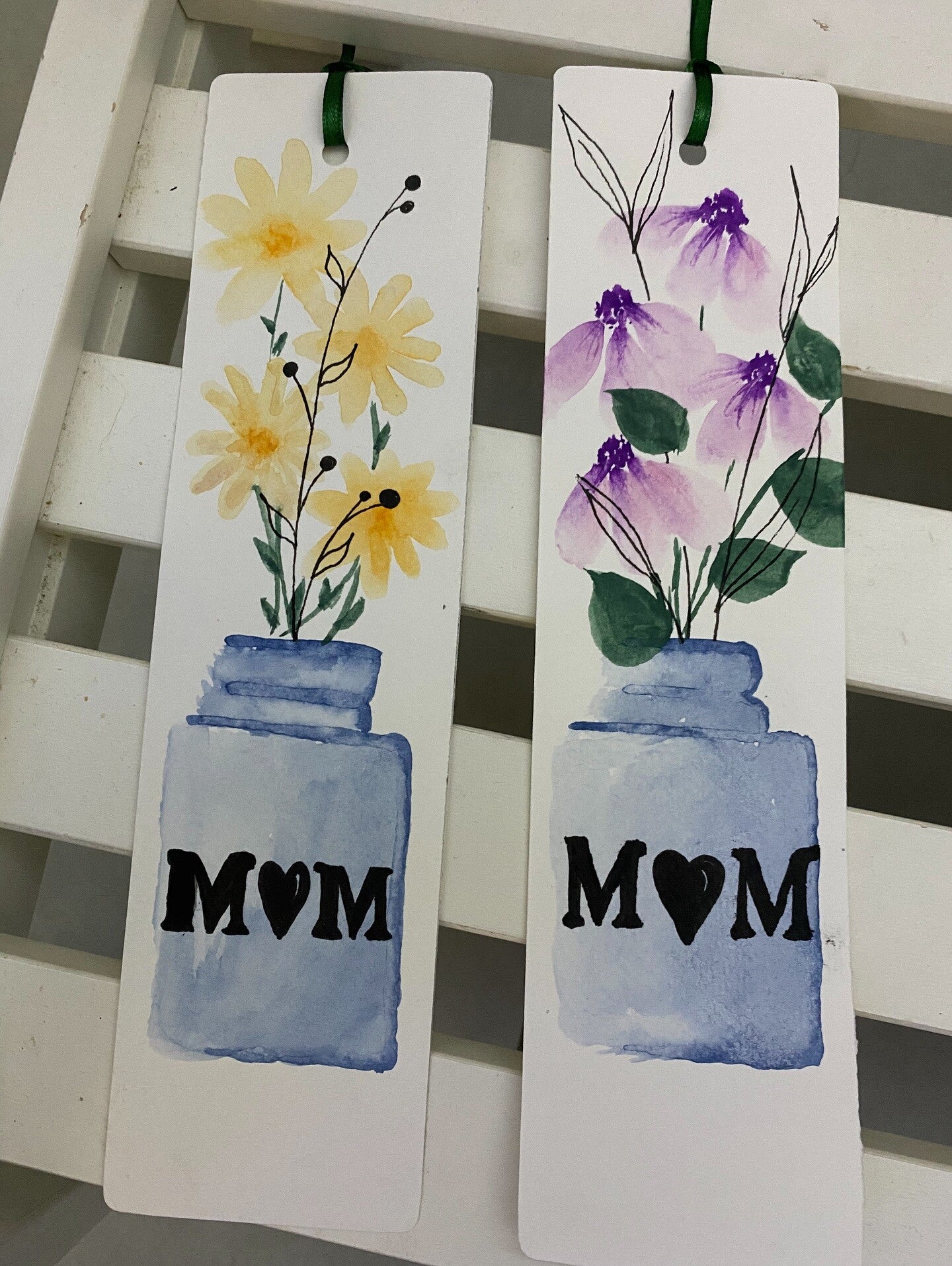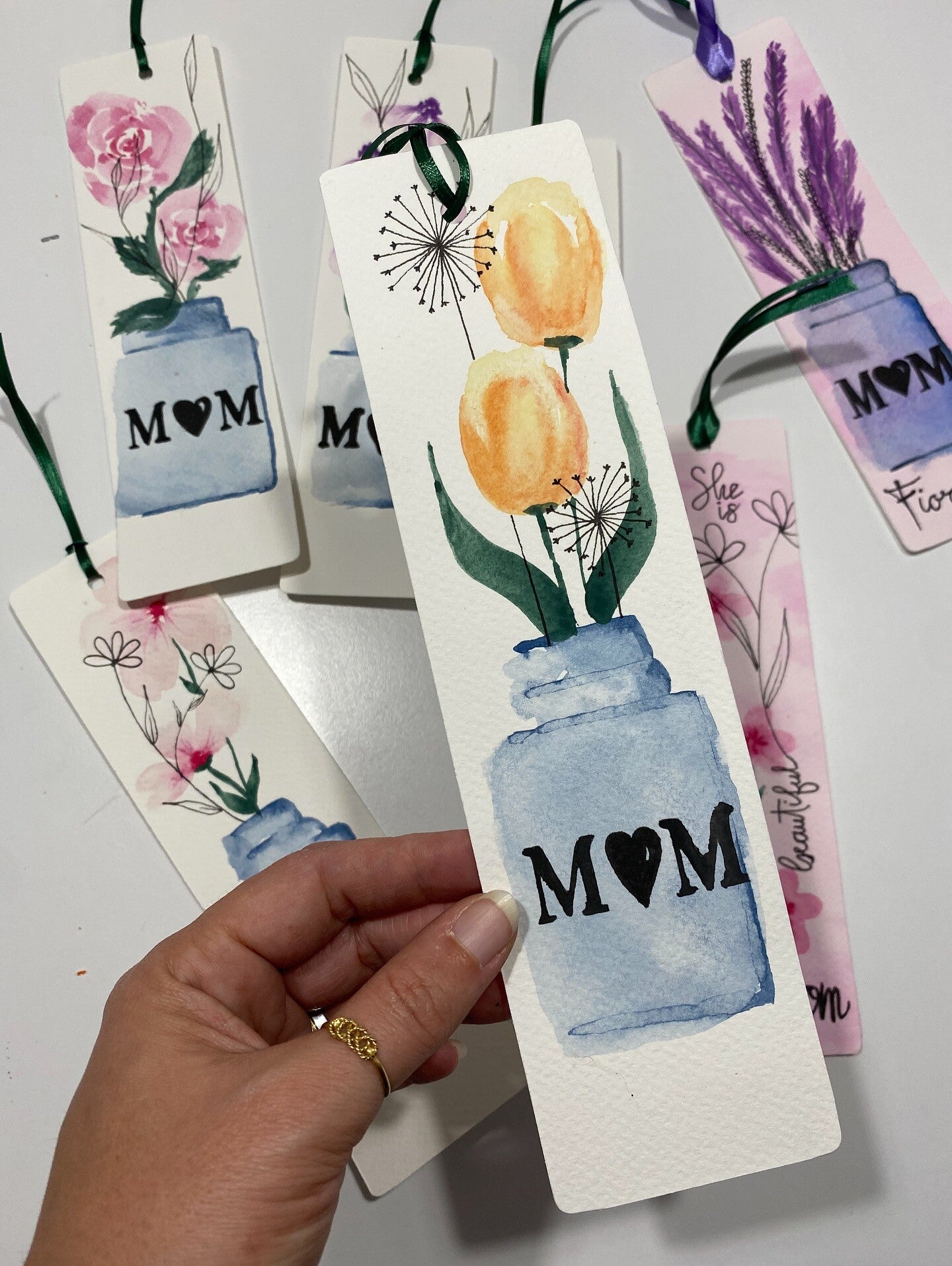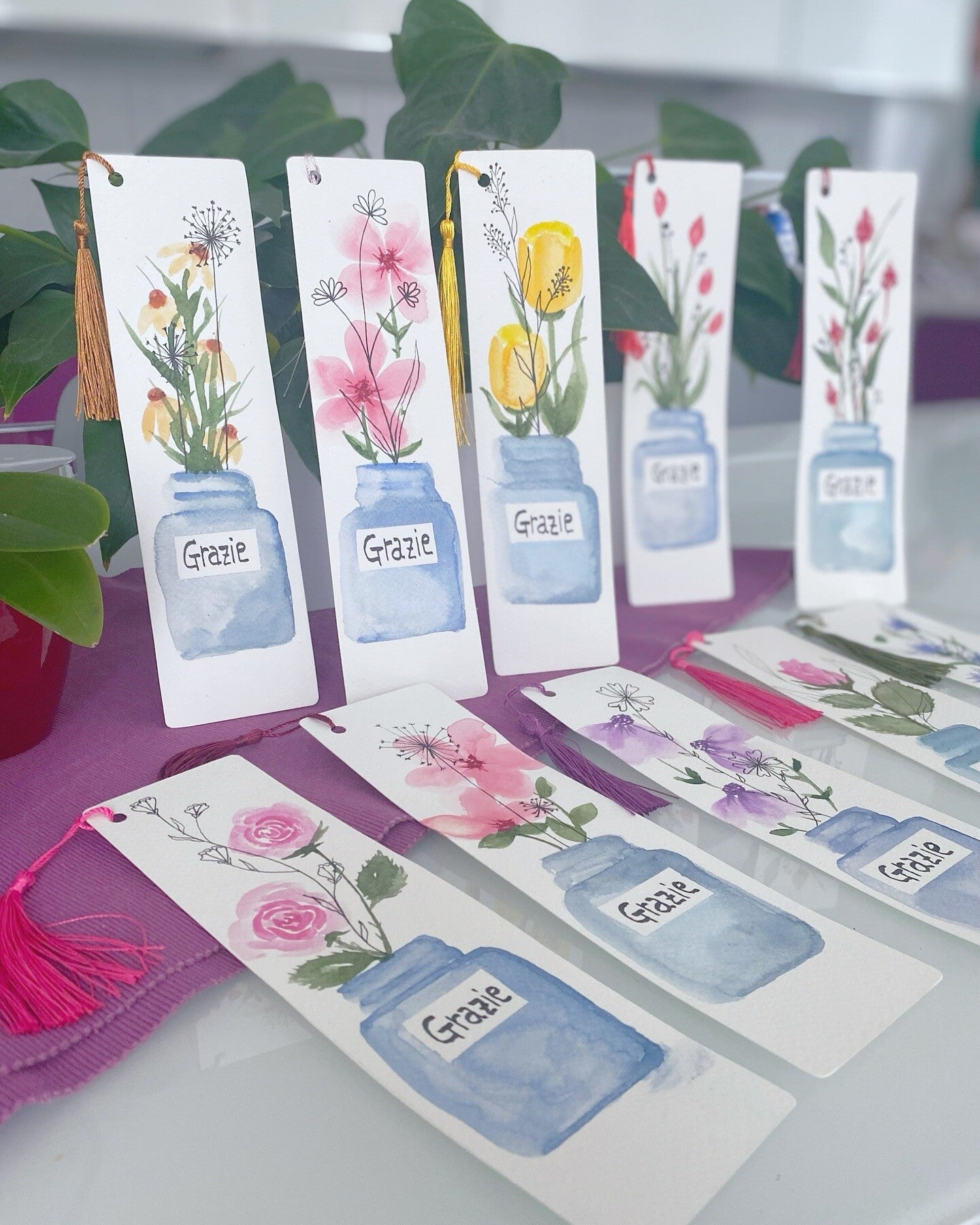 Un segnalibro in cartoncino spesso e ruvido con acquerello realizzato a mano rappresentante un vasetto con fiorellini, disegno in line art e nome.